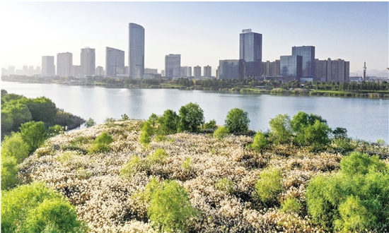 11月23日,曹娥江畔四环桥下,一大片雪白的芦苇花在冬日初阳的照耀下显得迷人夺目,与两岸高楼交相辉映,构成一幅“推窗见景”的江景图。