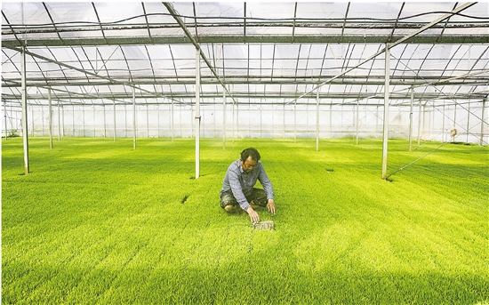 小越街道上虞炯宇家庭农场种粮大户李建明正在育秧大棚内育苗。育秧大棚面积约2亩,可满足约220亩水稻田的插种。农场内配备的自动化喷淋系统、全自动卷帘薄膜等先进硬件设施,让棚内秧苗可比一般露地秧苗提前3至4天插种,为水稻增产增收提供保障。