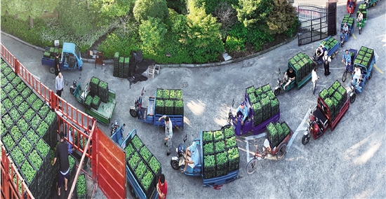 今年,有“江南吐鲁番”美誉的盖北镇迎来葡萄丰收。图为7月19日,盖北镇丰富村果园果农们正忙着采摘葡萄,装箱发往上海、宁波等地商超和相关加工企业。