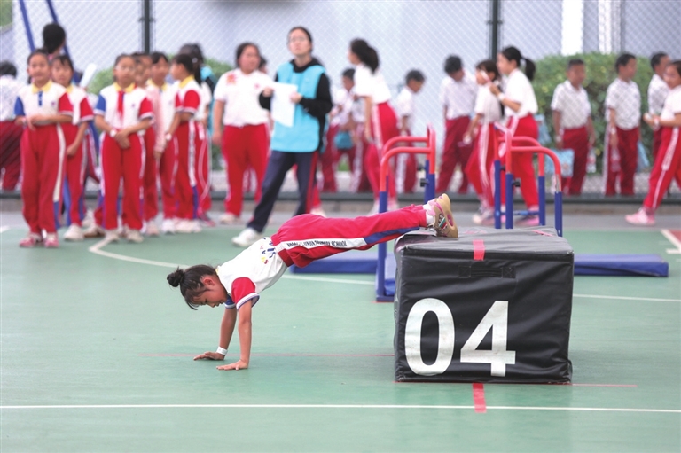 在比赛现场,记者看到各个项目虽然参赛学校广、人数多,但依然井然有序,节奏很快。和中长跑、引体向上、仰卧起坐、跳绳等体测项目比,小学生们进行的又要攀又要爬又要跑的双杠四肢悬垂移动+低位俯卧爬行+直线跑项目显得格外新颖和引人注目。只见测试学生双手握杆,悬垂身体在双杠上移动2米距离后下杠,随后又快速来到跳箱前,双脚放置于跳箱上,双手撑地,俯撑移动绕跳箱半圈,完成后直线跑15米向终点线冲刺,结束计时。