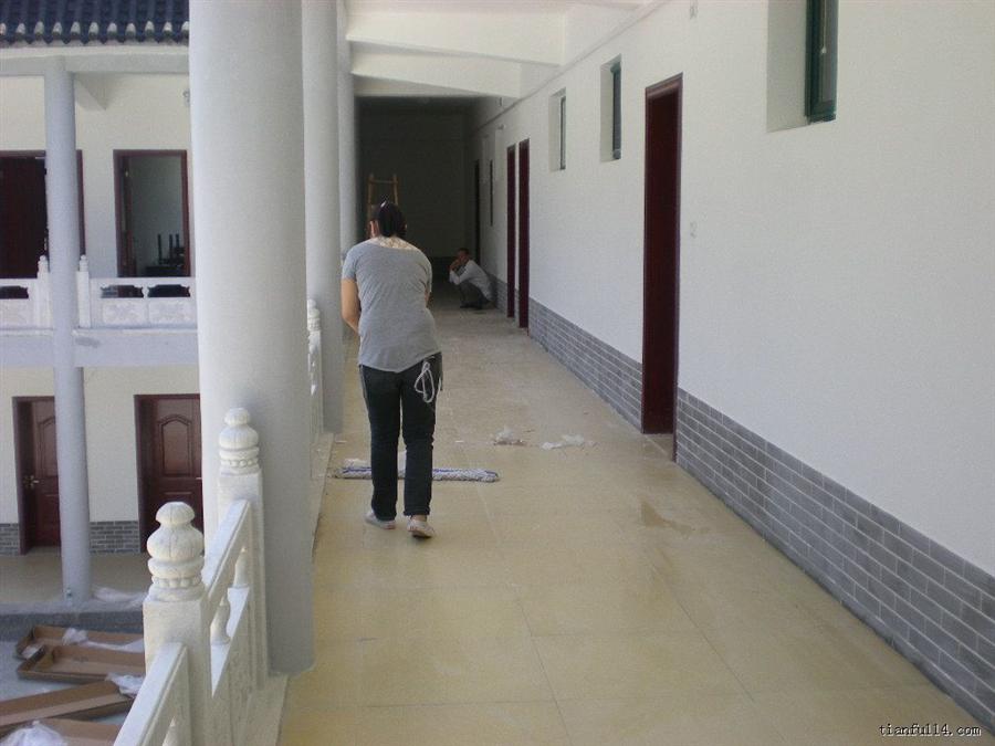(6)地面:清洁后的地板应该干净、无尘土、无印痕,光洁、明亮。客户验收后,应该再用干净的地拖把脚印擦去。